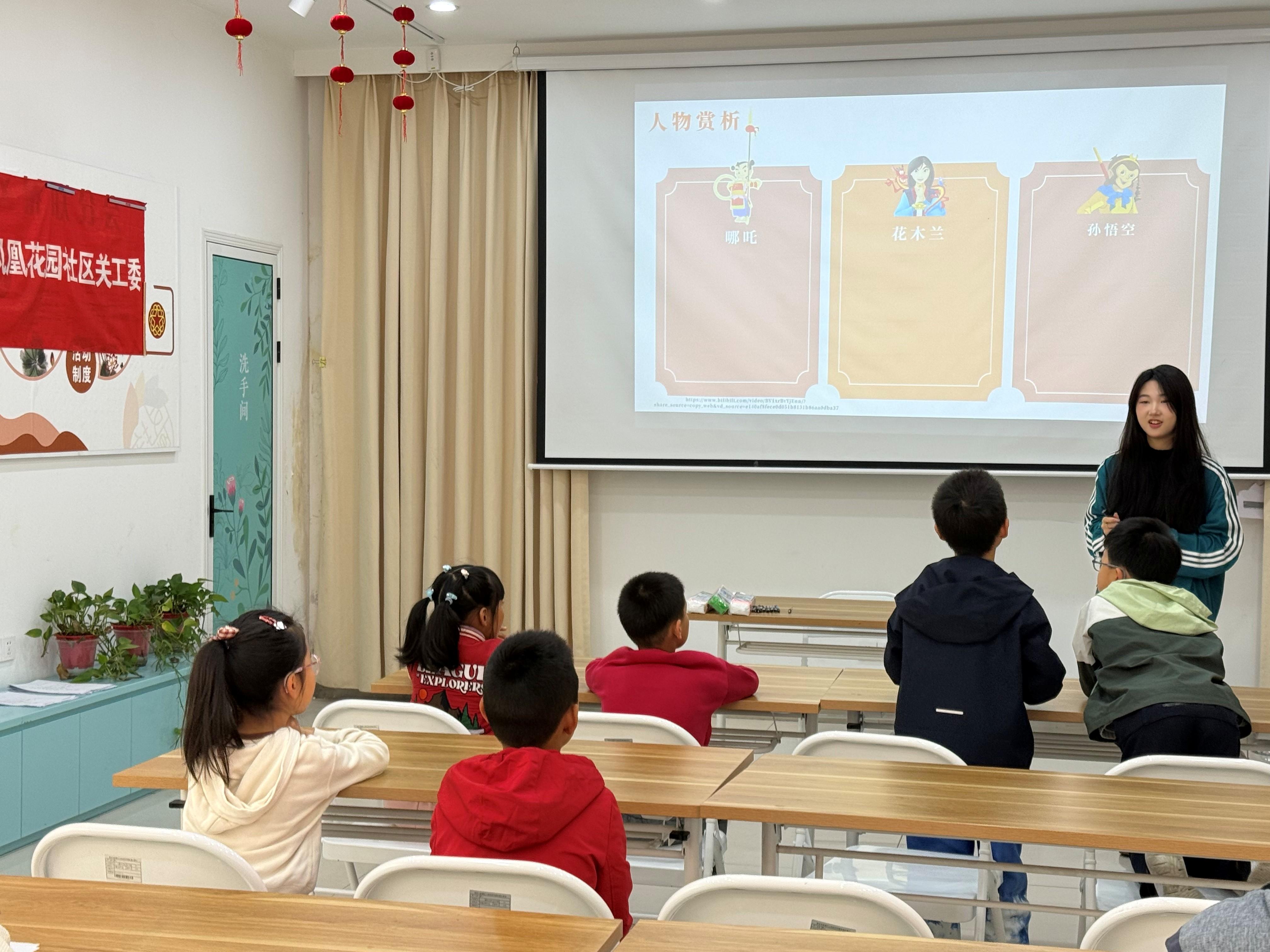 活动伊始,志愿者老师以趣味互动提问活跃现场氛围,迅速拉近与孩子们的距离。随后,大家共同观看《哪吒闹海》《花木兰》《大闹天宫》等经典动画片段,深入认识哪吒、花木兰、孙悟空三位传奇英雄。志愿者老师运用通俗易懂的语言,深度解读了三位英雄身上所体现的勇敢无畏、孝亲爱国、坚守初心的精神内核,引领孩子们在光影流转中感悟中华优秀传统文化的深厚底蕴与独特魅力。