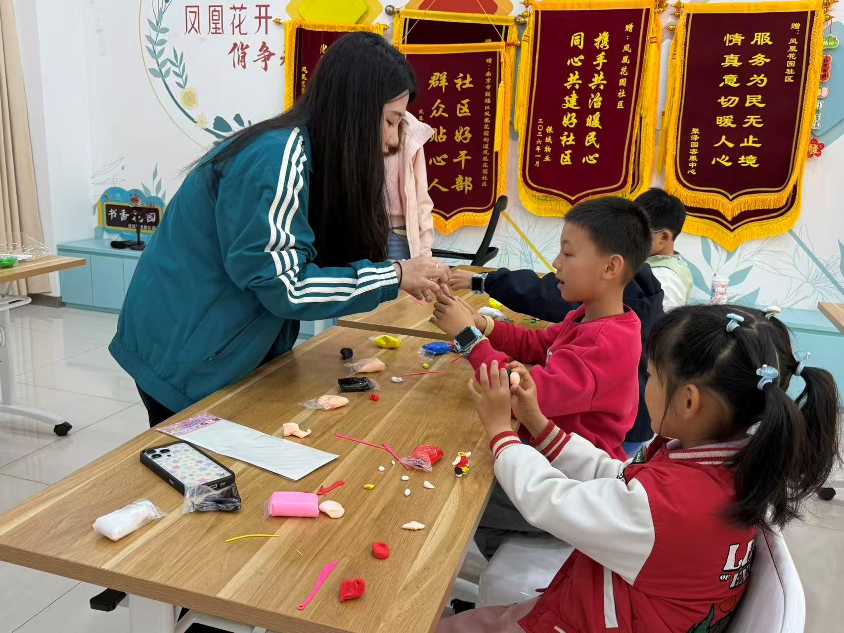 在“轻黏土捏制心中英雄”手工实践环节,志愿者老师以哪吒为示范,细致演示黏土的揉、搓、压、捏基础技巧与制作流程。孩子们全神贯注、充分发挥想象力,亲手塑造出哪吒、花木兰等鲜活的英雄形象,用指尖的创意与温度,深情诠释对英雄精神的理解与敬仰。