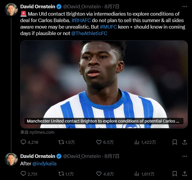 直播吧08月13日讯8月7日,TheAthletic名记奥恩斯坦爆出曼联问价巴莱巴的转会新闻后,表示这一消息首先由博主indykaila(绿帽哥)爆料,引发外网热议,该条动态近2000万次观看。近日,奥恩斯坦在做客播客节目时,首度回应了此事。