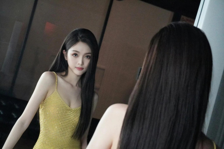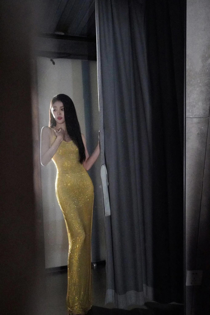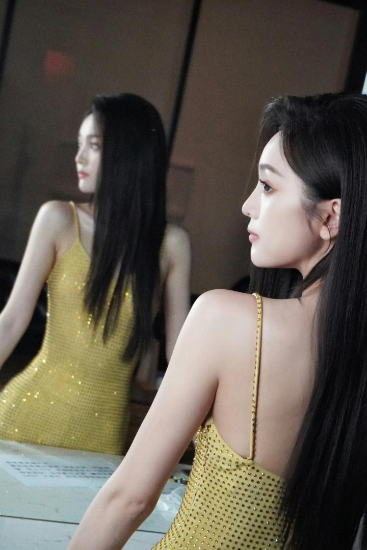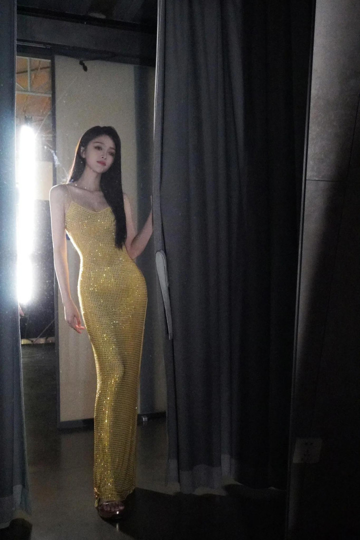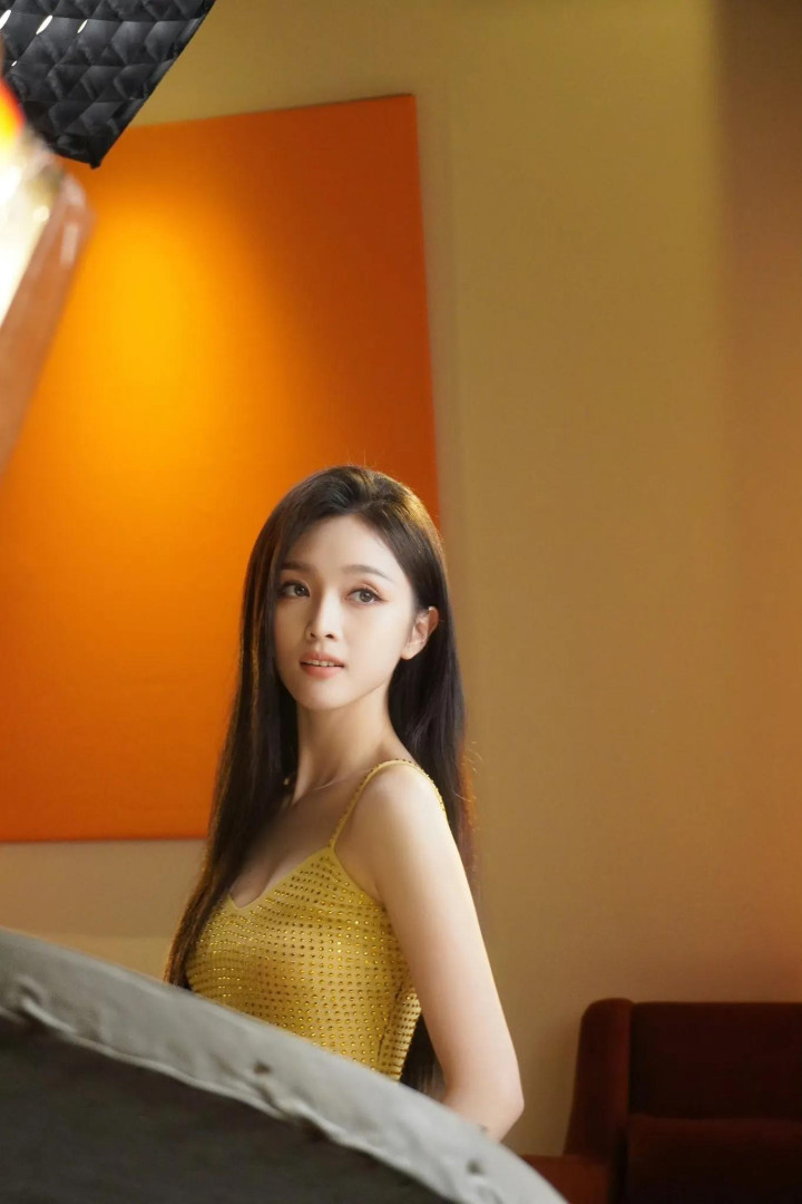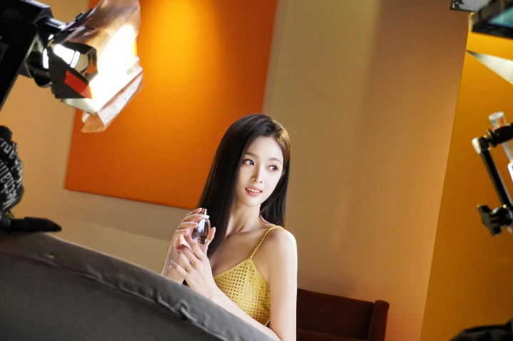 8.古力娜扎穿着白色居家服, 光着脚坐在地板上, 卷发披肩, 慵