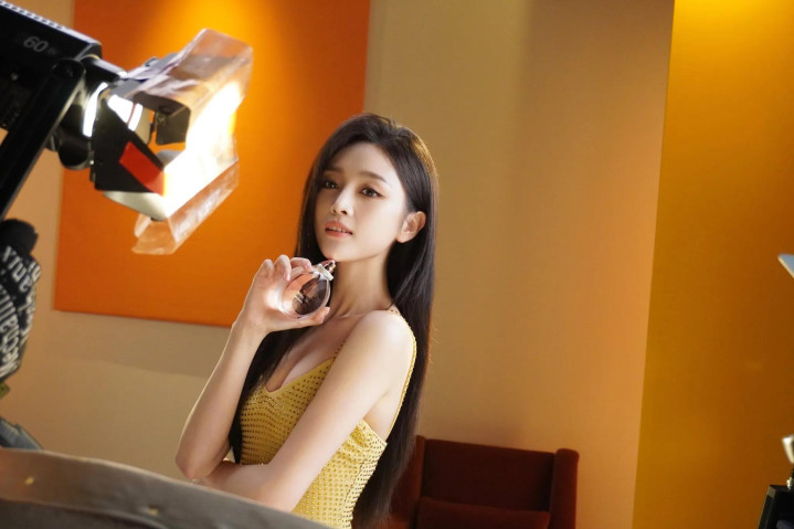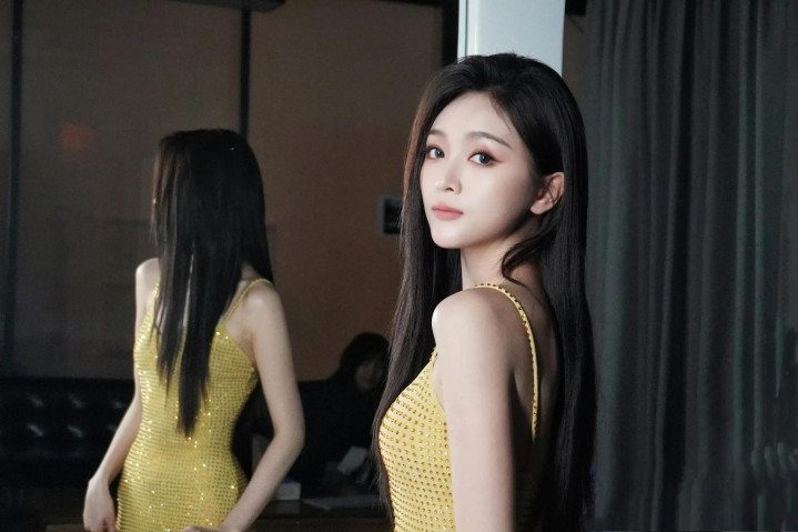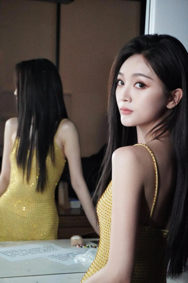 - 古力娜扎穿着白色居家服, 光着脚坐在地板上, 卷发披肩, 慵