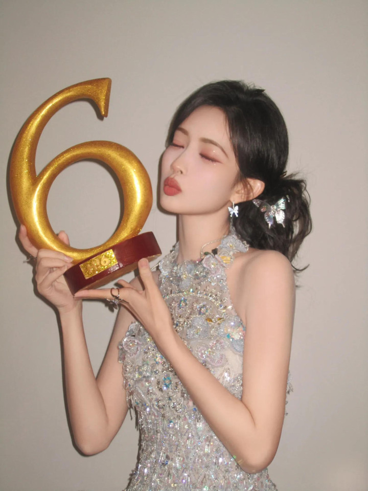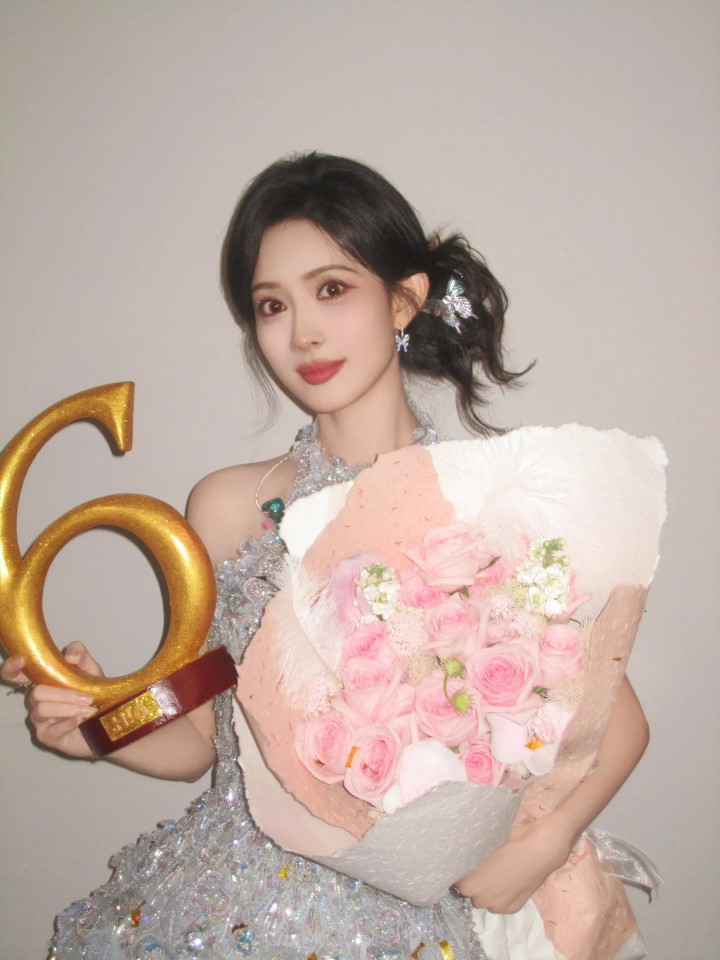 - 古力娜扎穿着白色居家服, 光着脚坐在地板上, 卷发披肩, 慵
