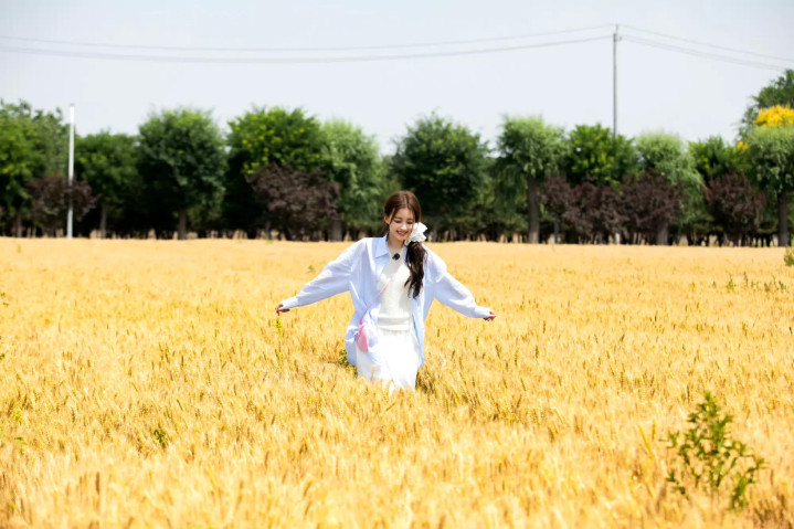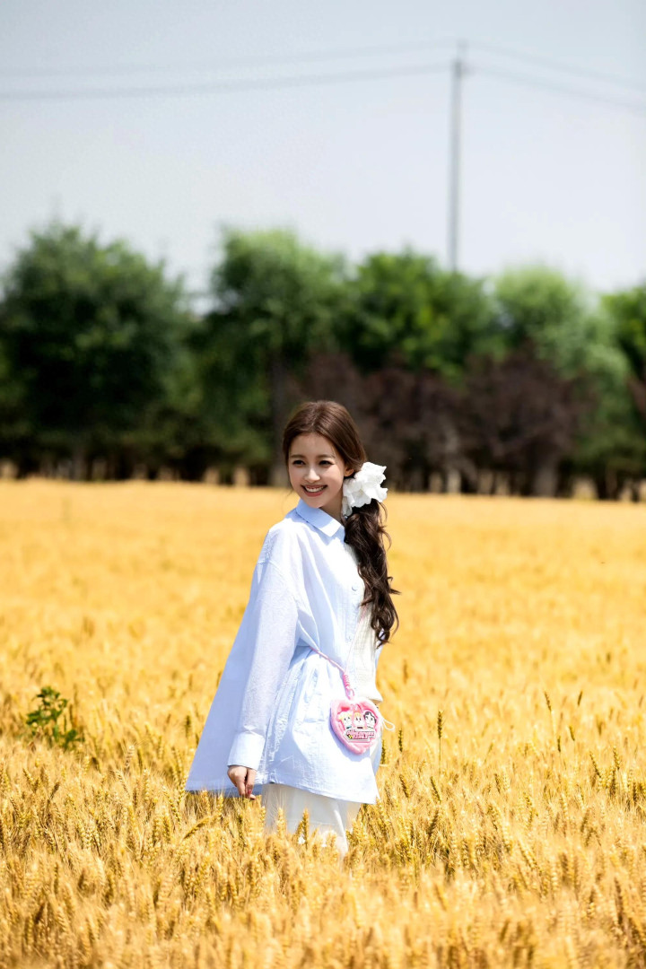 8.古力娜扎穿着白色居家服, 光着脚坐在地板上, 卷发披肩, 慵