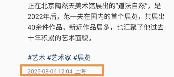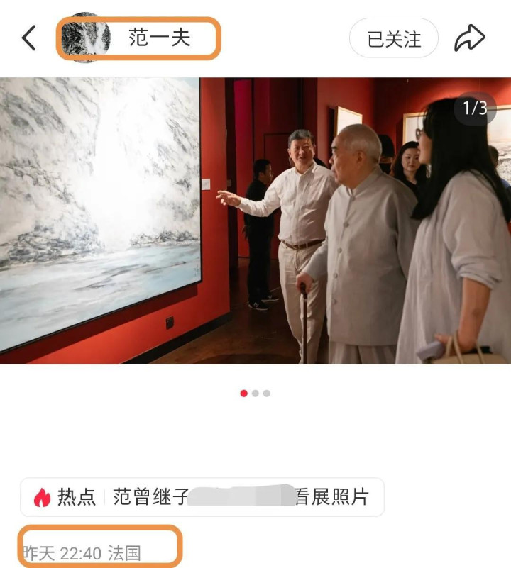 照片由范一夫于16日晚10点发布,因为IP定位在法国,所以被误传范曾是在法国看展,实际范曾去的是北京陶然天美术馆。
