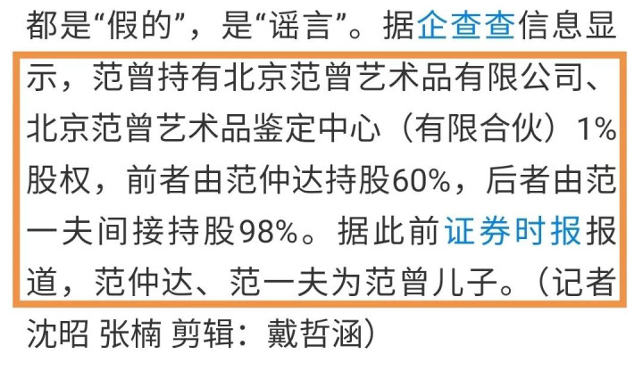 范一夫和范仲达以“范曾”之名开设了多家公司,如范曾艺术品公司、范曾艺术品鉴定中心等,据扬子晚报报道,范曾对这两家以他为名的公司持股才1%,范一夫、范仲达兄弟俩才是真正的大股东。
