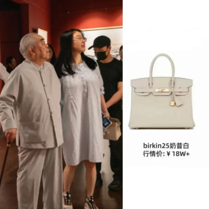 她打扮贵气,手上拎着十多万的奶昔白爱马仕birkin25,这是爱马仕的经典包款,徐萌嫁给范曾后,在打扮上尽显贵气,她戴过10多万的HarryWinston满钻项链,陪伴范曾在书房作画。