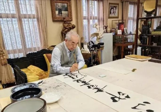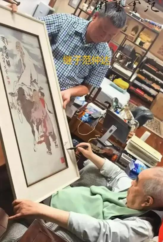 照片中,87岁范曾的状态还不错,他穿着一件中式浅灰马褂,独自坐在凳子上的背影很威严,62岁继子范一夫插手站在他身边,像正跟他介绍自己的得意画作。