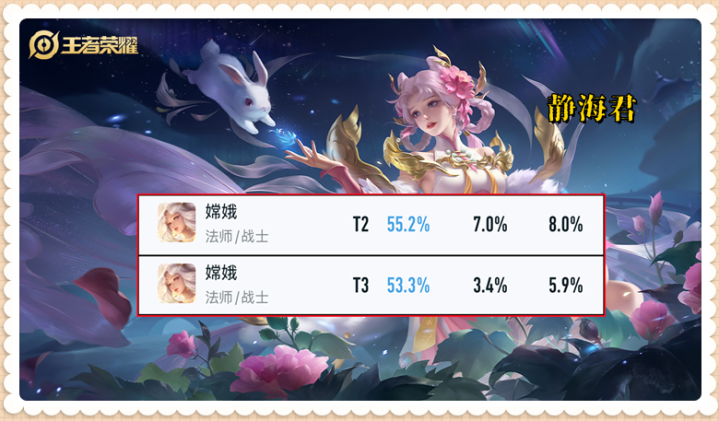 在顶端局,嫦娥的胜率是53.3%(仅比第一低了0.3%),ban选率为9.3%。