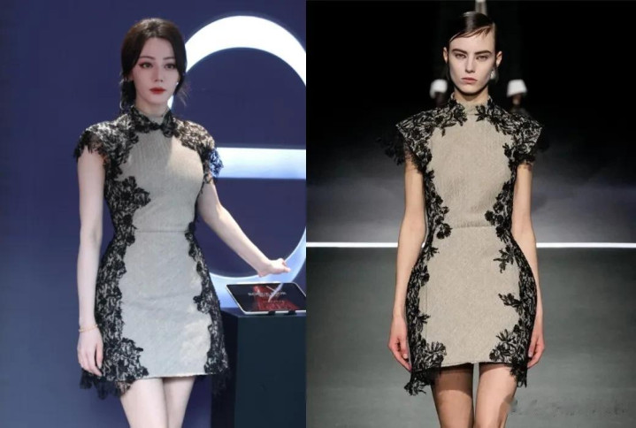 除了金色瓷砖裙,迪奥活动上,热巴穿着的蕾丝针织短裙更是别有一番风味。