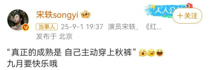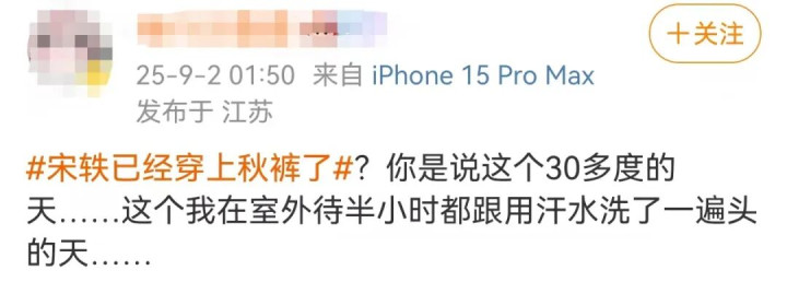对于穿秋裤,有北方网友表示,“秋天的第一个秋裤提醒是宋轶给的。”