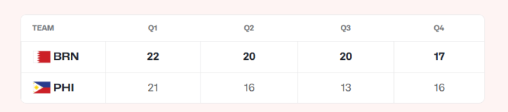 菲律宾男篮:乔尔-帕斯夸尔10分3板4助,哈拉尔9分2板1助,普林斯6分7板