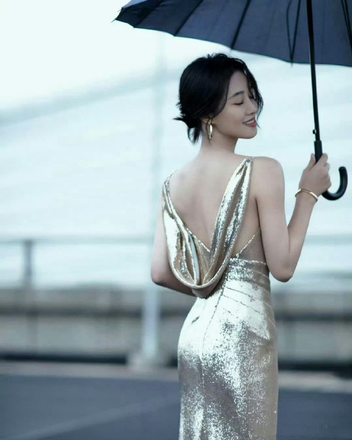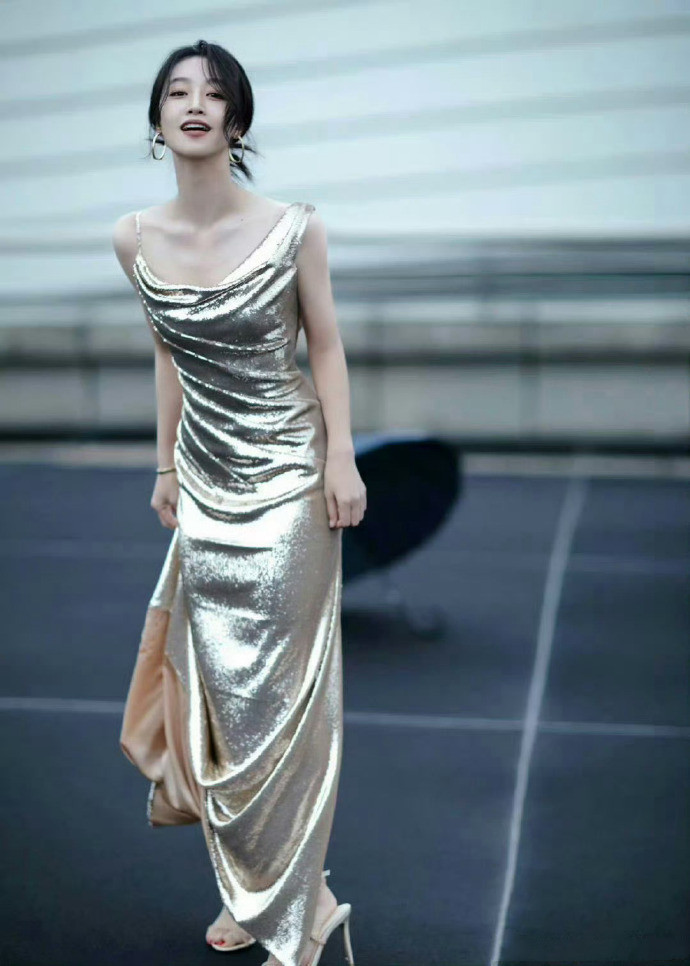 裙装的裁剪和设计也很有个性感,贴身的剪裁,完美勾勒出蓝盈莹的身材曲线,展示了她的优美身形。前领采用了较为宽松的垂褶设计,这种设计既增加了衣服的立体感,也为整体造型增添了一份轻松感和随意感。V字形状的领口设计拉长了颈部线条,让蓝盈莹的颈部看起来更加修长优美。露背的设计是亮点,深V露背设计增添了几分性感和神秘感。这样的设计能够很好地展示背部的曲线,使整体造型看起来既优雅又不失性感。
