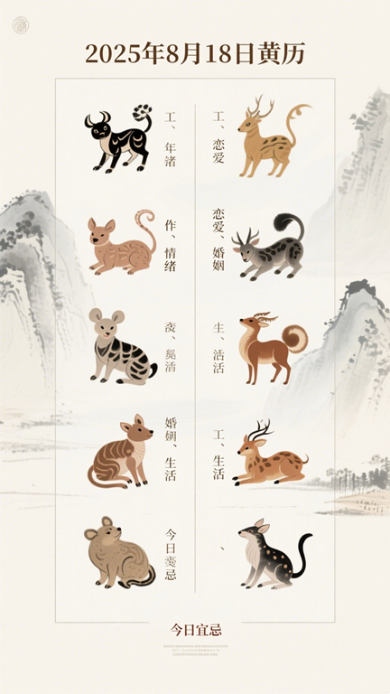 2025 年 8 月 18 日,星期一,阴历 2025 年闰六月廿五,乙巳年甲申月己未日。从黄历上看,今日宜祭祀、动土、筑堤、开池、会亲友、塞穴、入殓、移柩、破土、安葬;忌开光、出行、修造、上梁、入宅、安门、作灶、裁衣 。接下来,让我们一同深入探究 12 生肖在今日的全方位运势。