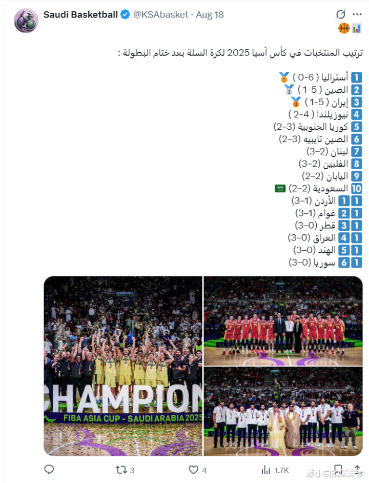 沙特男篮官方晒出了本次亚洲杯的完整排名还有战绩: