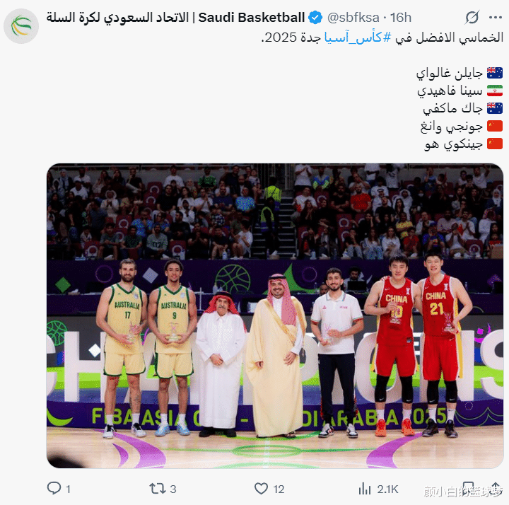 沙特官方还点名了决赛中发挥最出色的两人,澳大利亚的库克斯拿到30分9篮板2助攻,中国的胡金秋拿到26分3篮板3助攻1抢断5三分,换言之沙特官方为中国男篮的三位球员都点赞了。