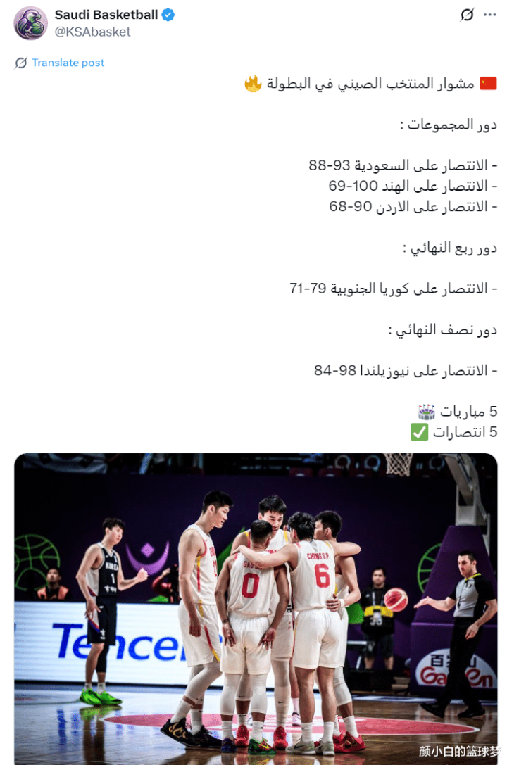 沙特官方也回顾了中国男篮晋级决赛之旅:93-88沙特、100-69印度、90-68约旦、79-71韩国、98-84新西兰。换言之在决赛前中国队是一波五连胜,最终决赛只输了1分。