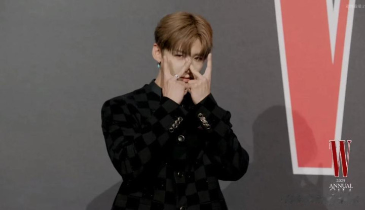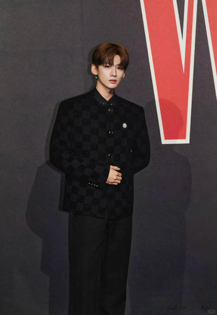 这次他的打扮是黑灰色相间的格子西装,特别衬他的身材,而且染了黄色的头发,还有耳朵上的蓝色耳饰都特别显白。
