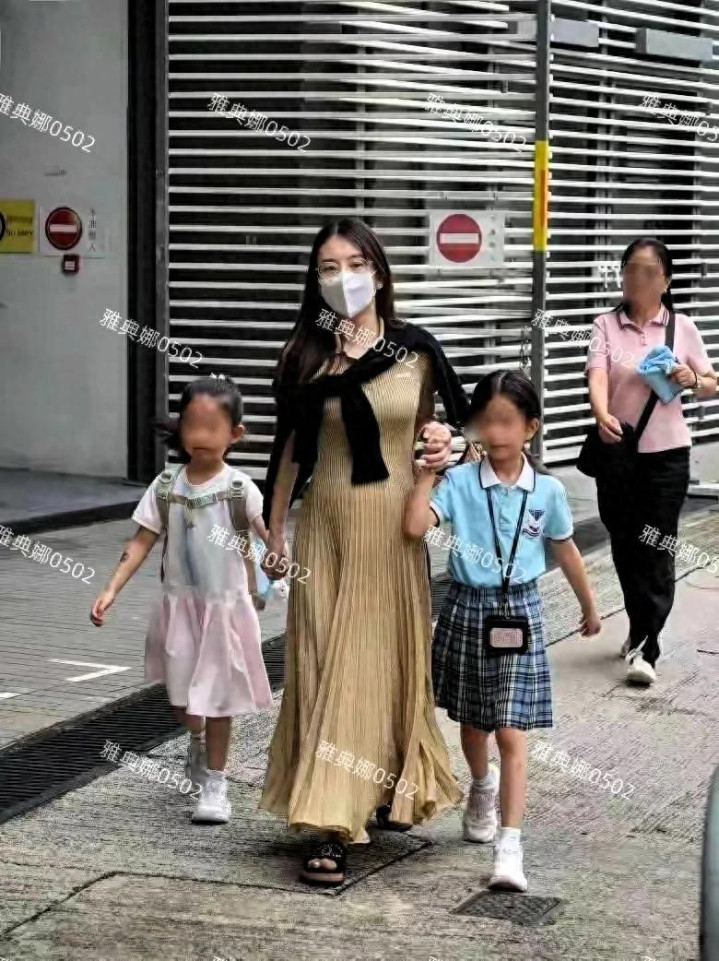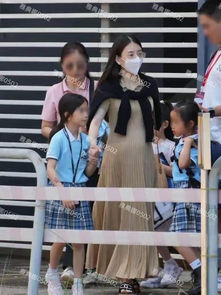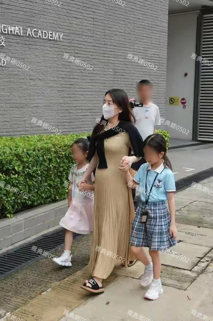 已经进入孕晚期的方媛,今天挺着大肚子送两个女儿上学,38岁的她穿着金色的百褶裙,身上搭了件黑色开衫,脚上穿了双香奈儿的平底拖鞋,虽然浑身上下都是名牌,但没有化妆离开了高跟鞋的方媛,立马没有了明星般的天王嫂气场,像一个普通的带娃主妇,虽然她肚子很大走路不方便,但仍左右手各牵一个女儿健步如飞,急急忙忙把两个女儿送到学校。