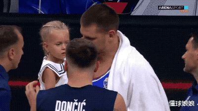 赛后,约老师抱着女儿和东契奇互动,奥格涅娜还和东契奇击掌了,可爱翻了。