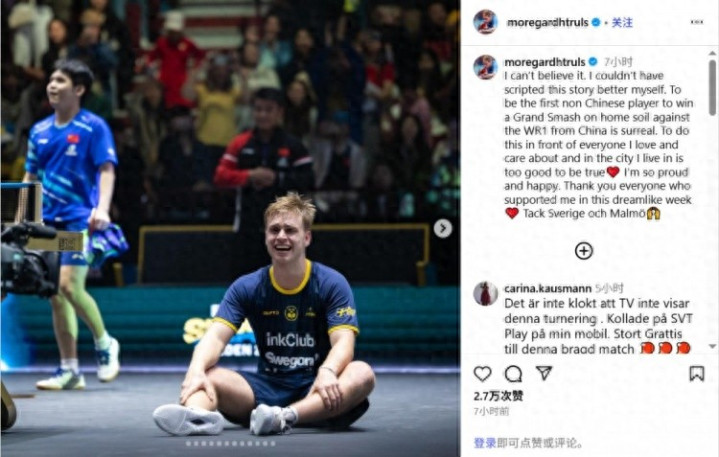 赛后,莫雷加德更新社媒庆祝这个来之不易的冠军。莫雷加德写道:难以置信!我简直不敢相信这个故事能如此完美。成为首位在主场击败世界排名第一的中国选手,赢得大满贯赛事的非中国选手,这种感觉太不真实了。在我所爱和关心的人面前,在我生活的城市中取得这样的成就,简直像做梦一样❤️ 我感到无比自豪和快乐。感谢所有在这梦幻般的一周里支持我的人❤️ 感谢瑞典和马尔默的支持🙌。