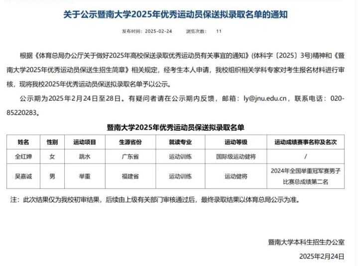 早在今年2月,暨南大学公示2025年优秀运动员保送拟录取名单通知,全红婵在列。拟录取名单显示,跳水运动员全红婵拟就读运动训练专业,运动等级为国际级运动健将。