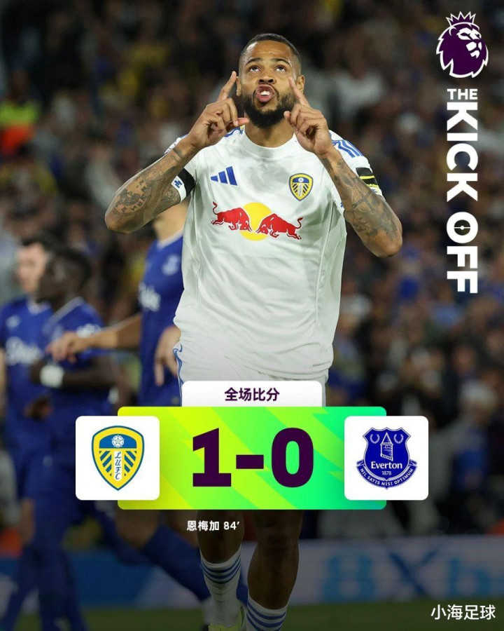 利兹联英超主场首秀1-0力克埃弗顿。比赛第84分钟塔尔科夫斯基禁区内手球送点,恩梅加主罚命中锁定胜局。利兹新援古德蒙松第37分钟内切爆射迫使皮克福德做出关键扑救,尼奥托半场结束前劲射擦梁而出。埃弗顿新援格拉利什第71分钟替补登场完成首秀,但球队延续八月魔咒——近四年8月联赛11场未尝胜绩。
