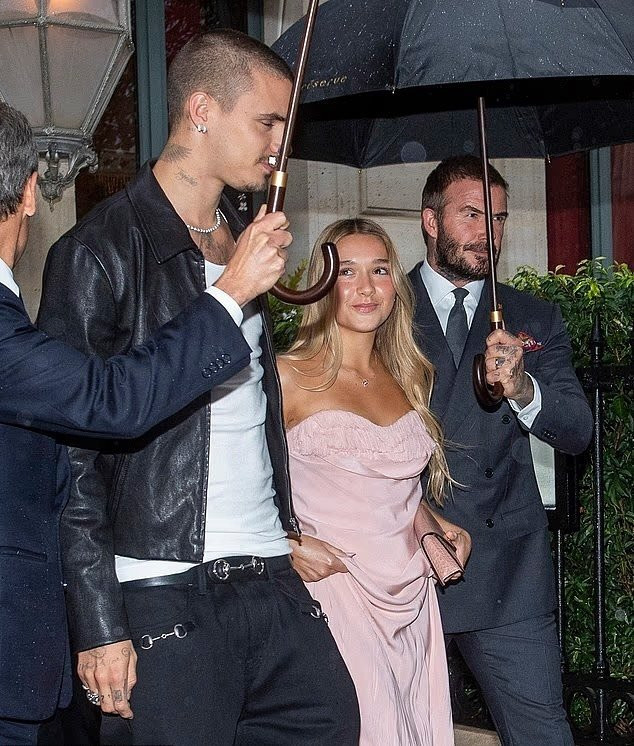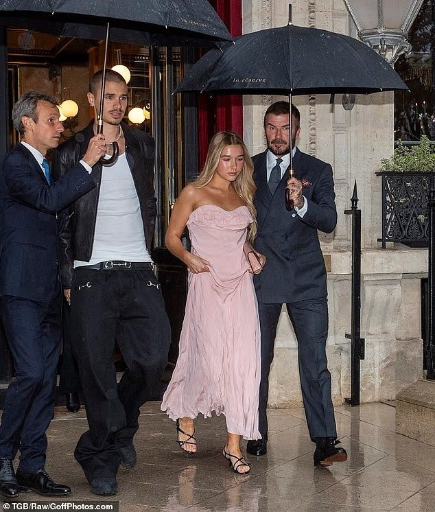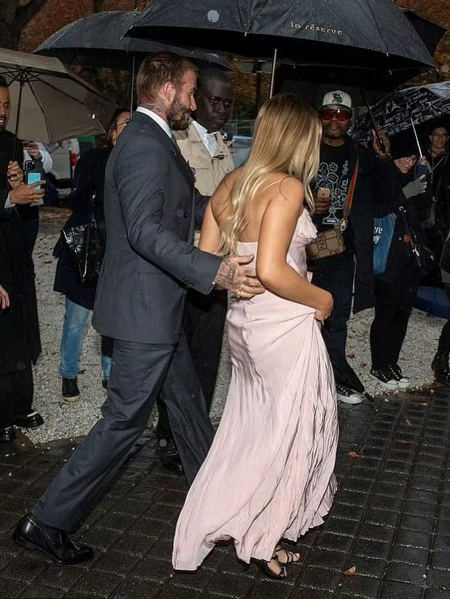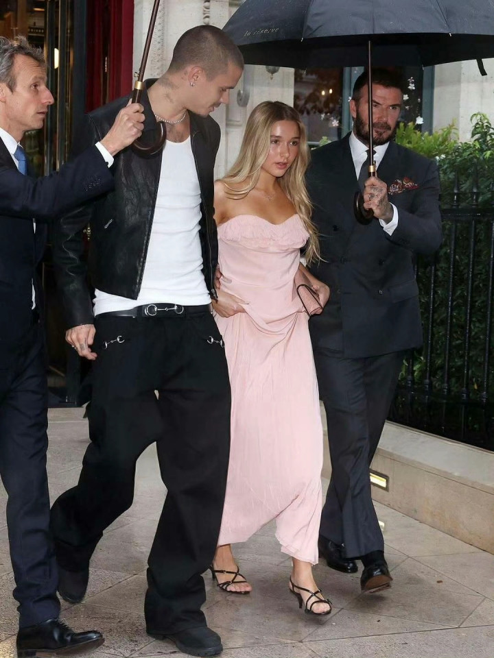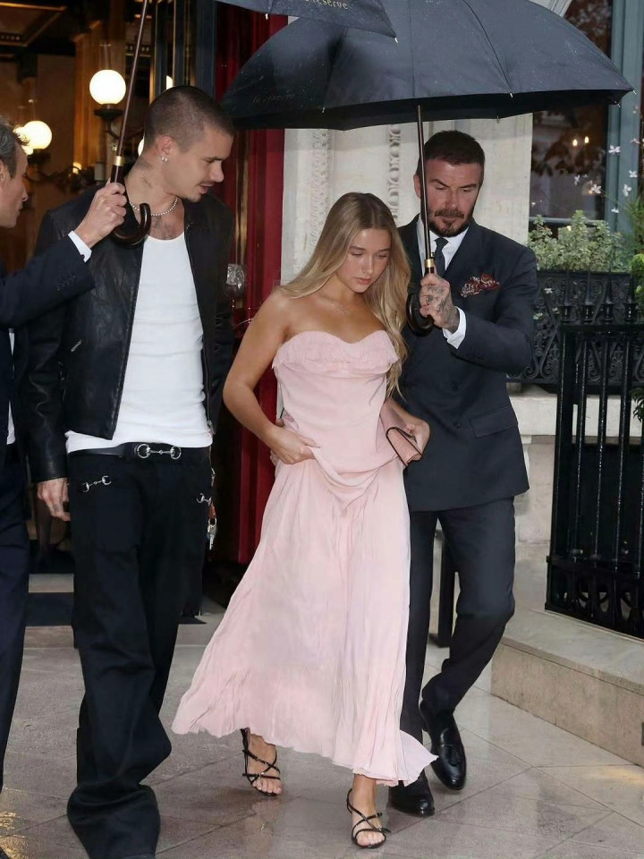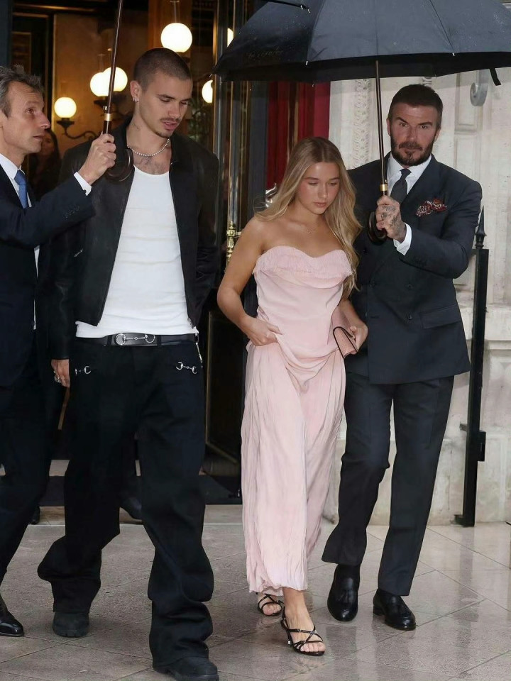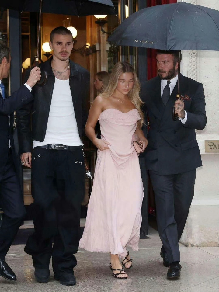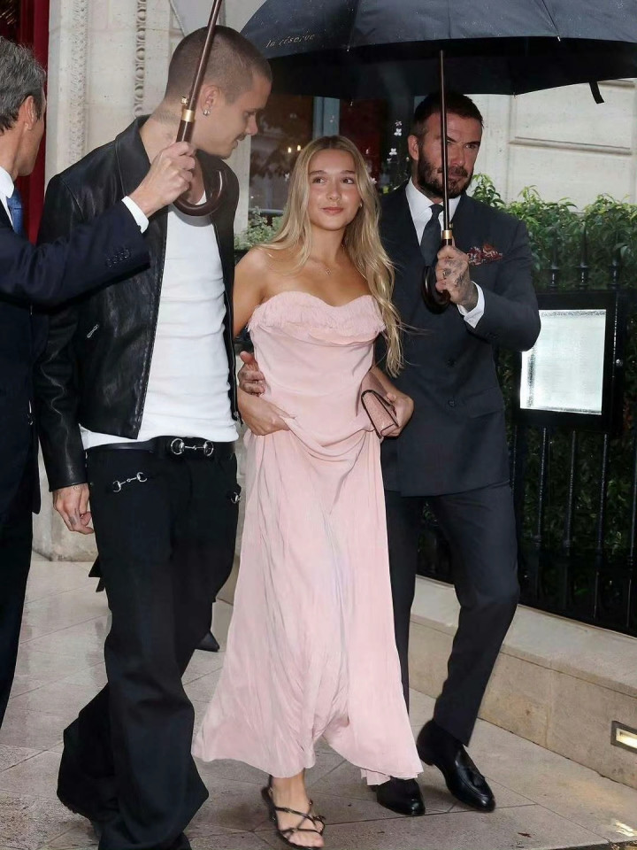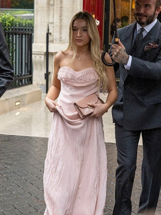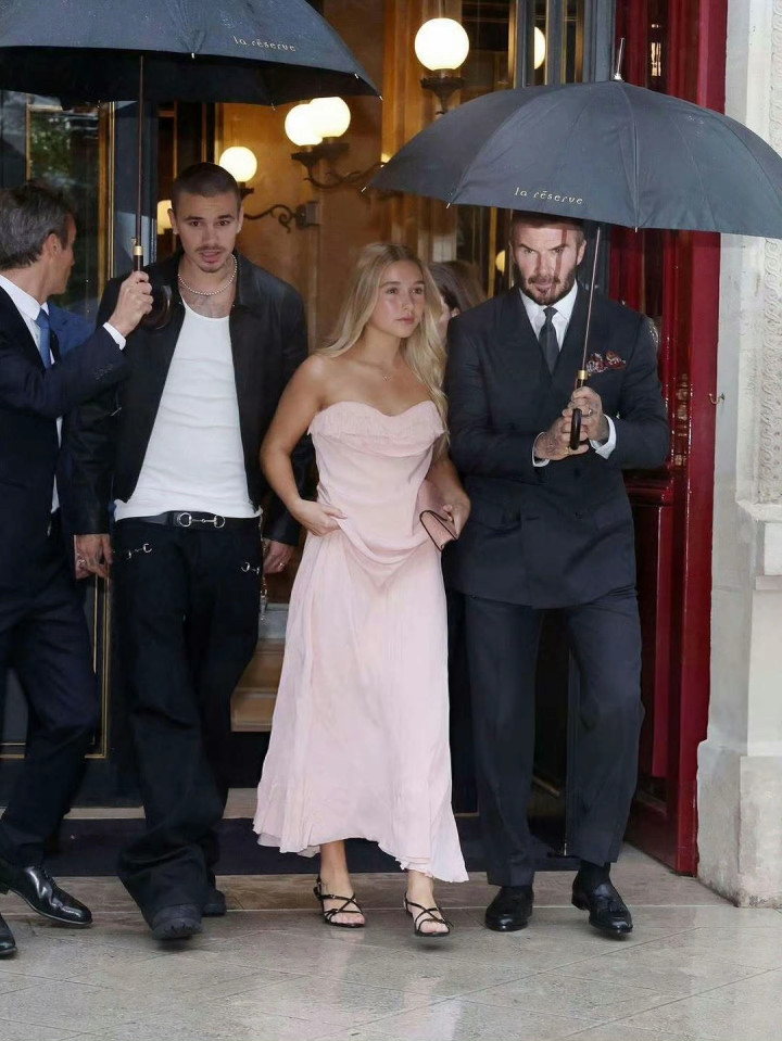 贝克汉姆这个女儿奴谁也信不着,必须亲自给女儿小七打伞才放心,14岁的小七已经长成了亭亭玉立的大姑娘,她一身粉色露肩礼服跟着爸爸妈妈和哥哥们一起亮相巴黎时装周。
