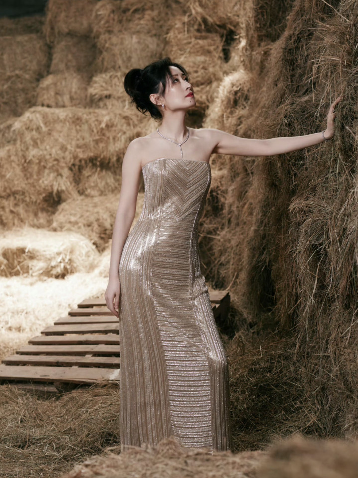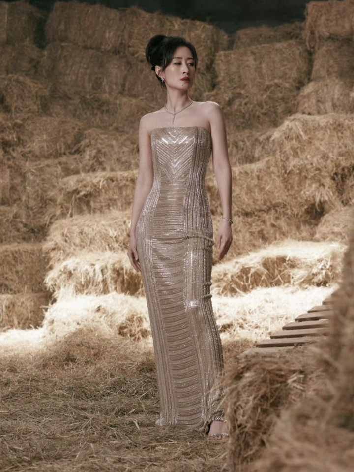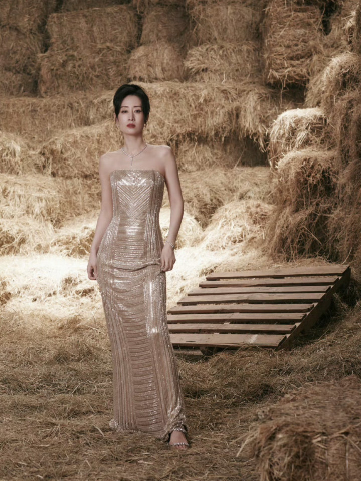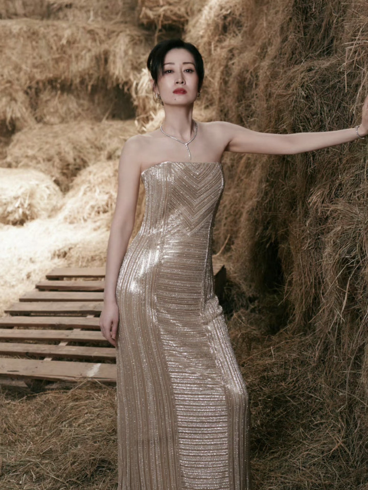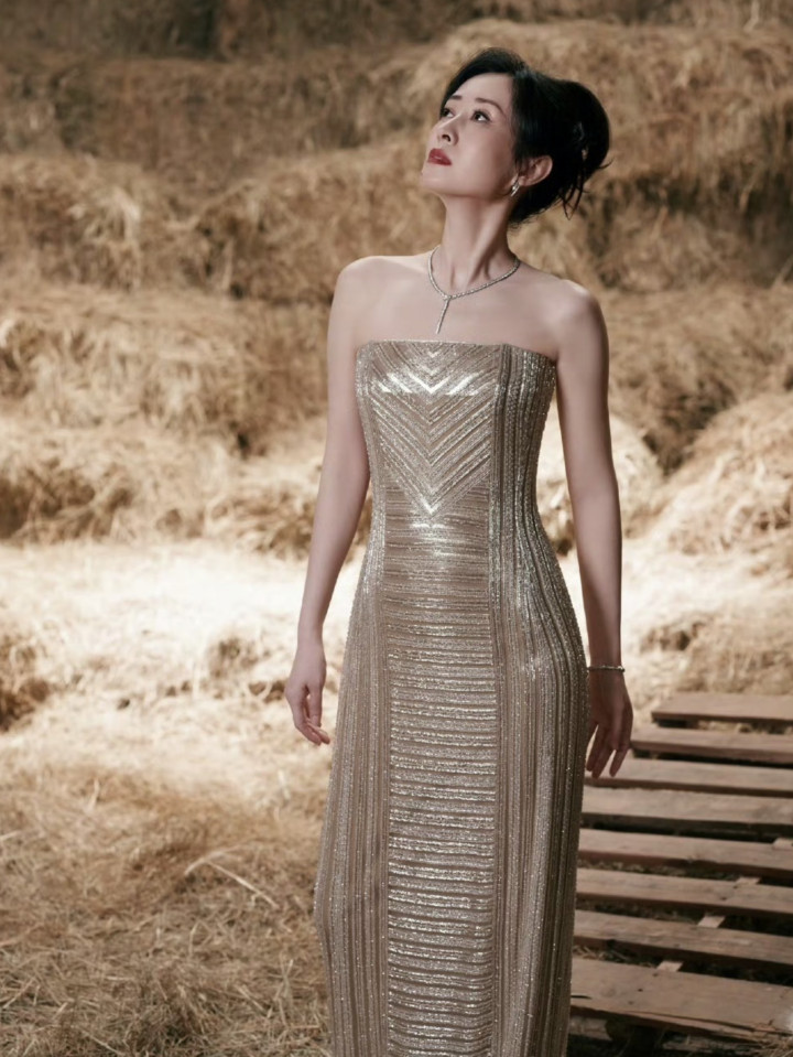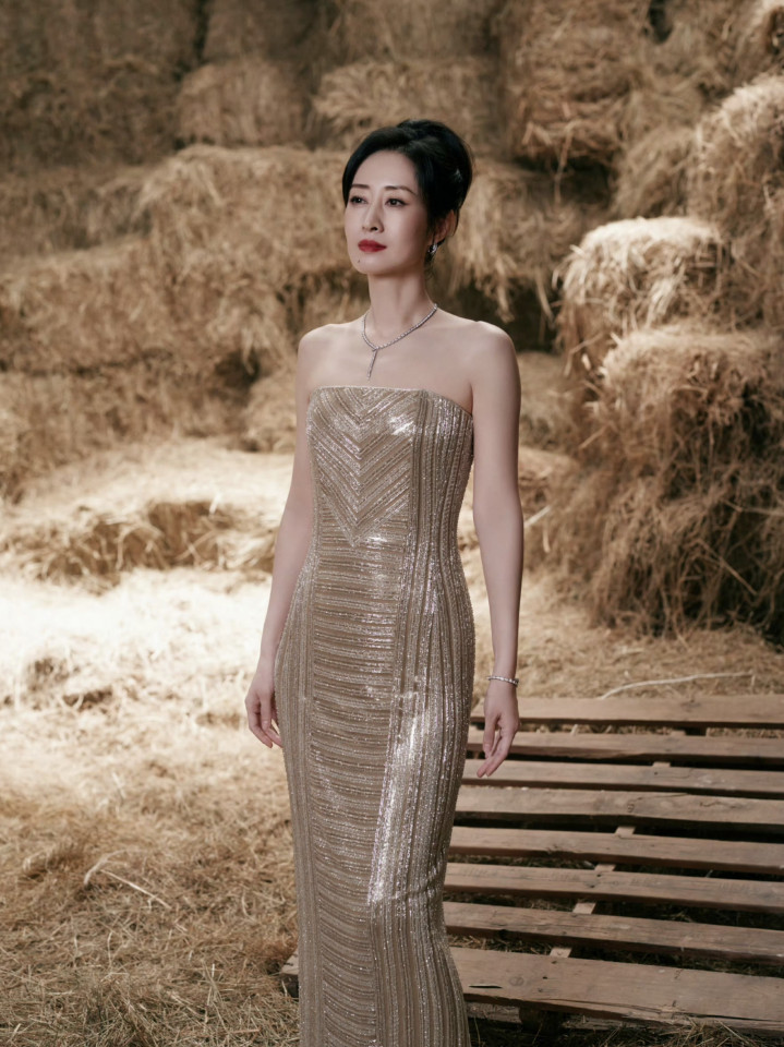 抹胸的设计本就考验身形与气场,而刘敏涛却驾驭得恰到好处。领口贴合肩颈,将她线条清晰的锁骨与流畅的肩背曲线完整展露,没有过分刻意的露肤,却透着一种克制的性感;裙身顺着身形自然垂落,在腰腹处轻轻收束,恰好凸显出纤细却不纤弱的腰线,往下又缓缓散开,衬得胯部线条柔和,裙摆曳地时,每一步走动都带着韵律感,既不会显得臃肿,也不会让人觉得单薄,将成熟女性历经岁月沉淀后的匀称身形,展现得刚刚好。没有少女的青涩单薄,也没有刻意追求的极致纤瘦,这份曼妙,是时光赋予的舒展与匀称,藏着独有的韵味。